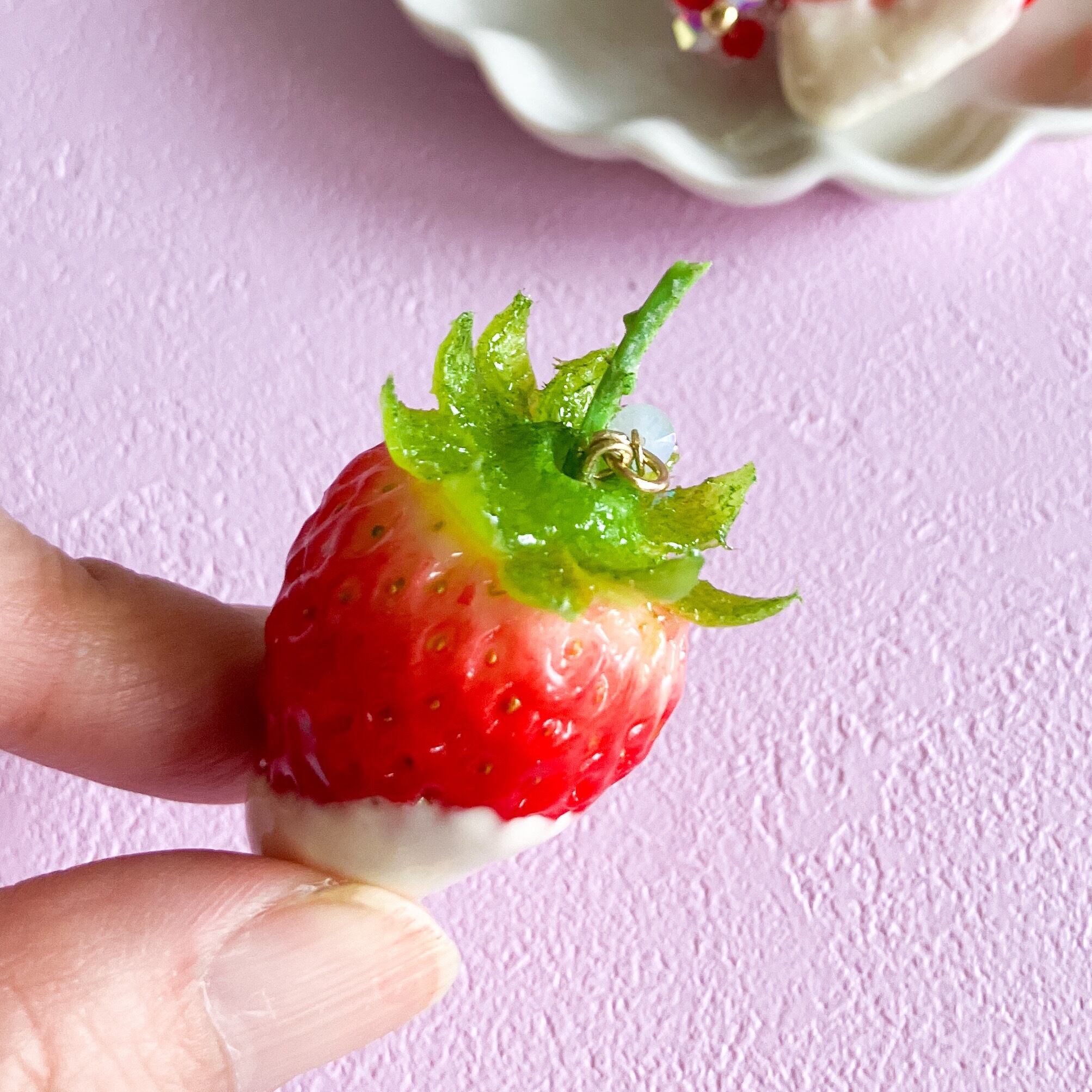 粘土が硬化後に着色、種付け、ヘタ付けなどを行いUVレジンコーティングで仕上げます(ヘタも粘土です)